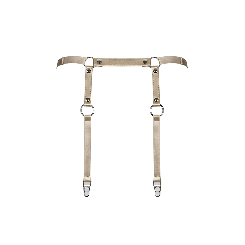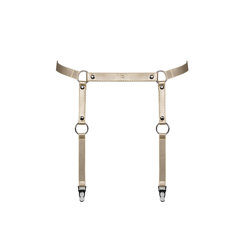 Luxe goudkleurige faux lederen jarretelgordel met verstelbare taille voor een perfecte pasvorm. De bandjes zijn verbonden met metalen ringen, glanzende nagels zorgen voor een verleidelijk accent. Zacht en huidvriendelijk materiaal. Het afgebeelde “OBS-A765 Harnas goud” is niet bij de levering inbegrepen en is apart verkrijgbaar.