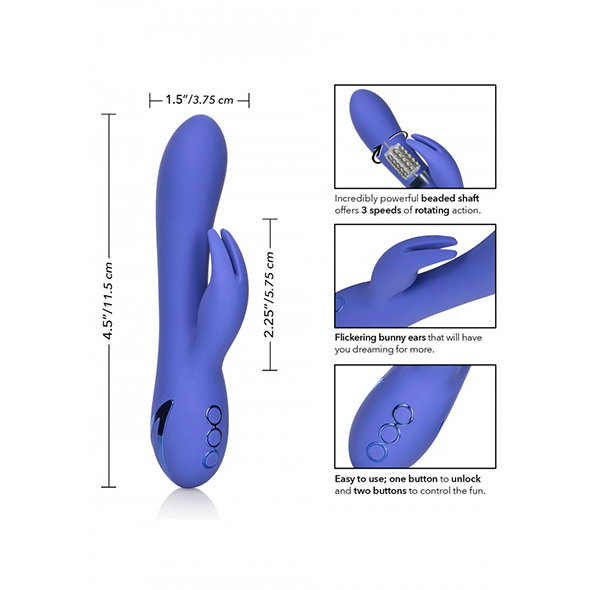 De Beverly Hills Bunny van CalExotics is een rabbit vibrator die de G Spot, clitoris en de vagina stimuleert. Met zijn roterende balletjes met 3 standjes wordt de ingang van de vagina gemasseerd en geeft hij jou op 3 snelheden een onvergetelijke verwenning. Met zijn Memory chip staat jou laatst gekozen functie in zijn geheugen. De volgende keer ga je dus gewoon vanuit die positie verder. Ook zorgt zijn 10 delige vibratieprogramma voor een verwenning op maat. Met deze oplaadbare, waterbestendige en natuurlijk bodysafe vibrator zijn ongekende hoogtepunten binnen handbereik.