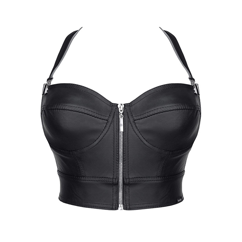 Beugelcup Black top Marta met 2-way front zipper van Demoniq. Een bijzonder kenmerk van deze top is de riemoplossing met een clipbare 2-wegritssluiting, die je individueel kunt verstellen, zodat de ritssluiting perfect aansluit op je rondingen. Je kunt er ook een off-the-shoulder top van maken door de bandjes er helemaal af te halen. Vind je favoriete combinatie en complementeer je outfit met bijpassende shorts of rok uit deze lijn.