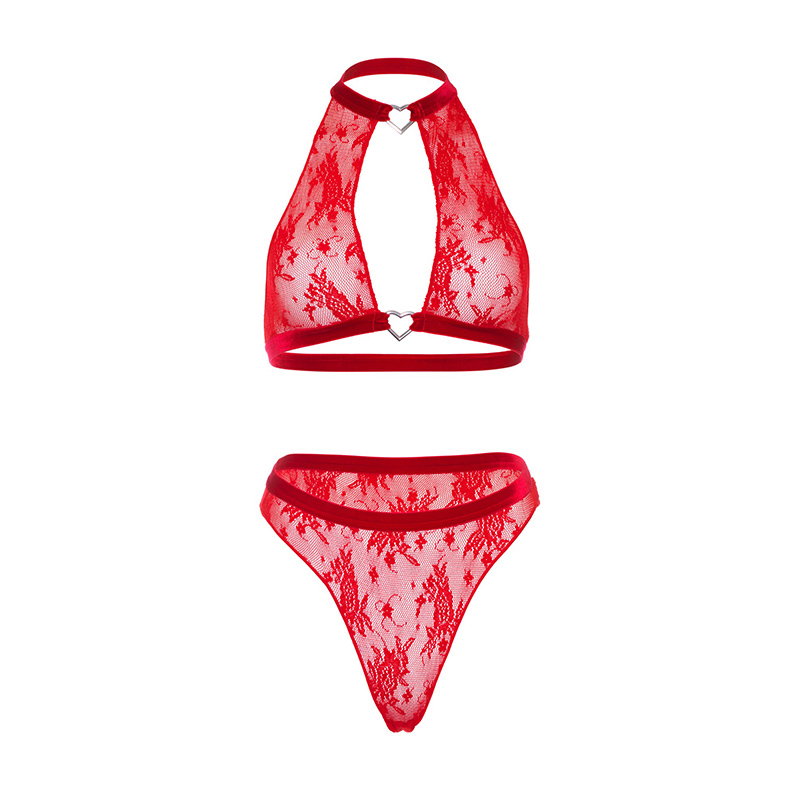 2-delige Halter top & thong panty met fluwelen afwerking met hartsleutelgat en bijpassende string-slip met hoge taille.