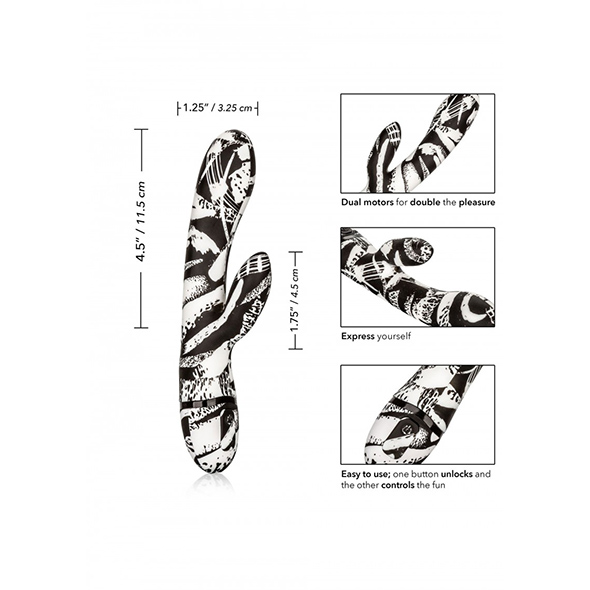 De Hype Dual Wand Rabbit Vibrator is een krachtig seksspeeltje voor stimulatie van de clitoris en G Spot tegelijk. De Hype heeft twee afzonderlijk geplaatste motoren en verwent de clitoris en G Spot met 10 verschillende vibratie modes. Met de bedieningsknopjes kun je de motoren eenvoudig afzonderlijk van elkaar laten werken en schakel je door de menu’s heen op zoek naar jouw favoriet. De Hype is waterdicht dus of je hem nu in bed, bad of onder de douchegebruikt het kan allemaal.
