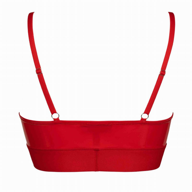 Vrouwelijk en zeer sexy! Rode vinyl bh die als lingerie of top gedragen kan worden. Diep vallende V-hals en brede stretchband aan de onderkant van de buste. Dunne verstelbare bandjes. Je kunt het combineren met de bijpassende Jade string maar ook met een rok, legging of short.