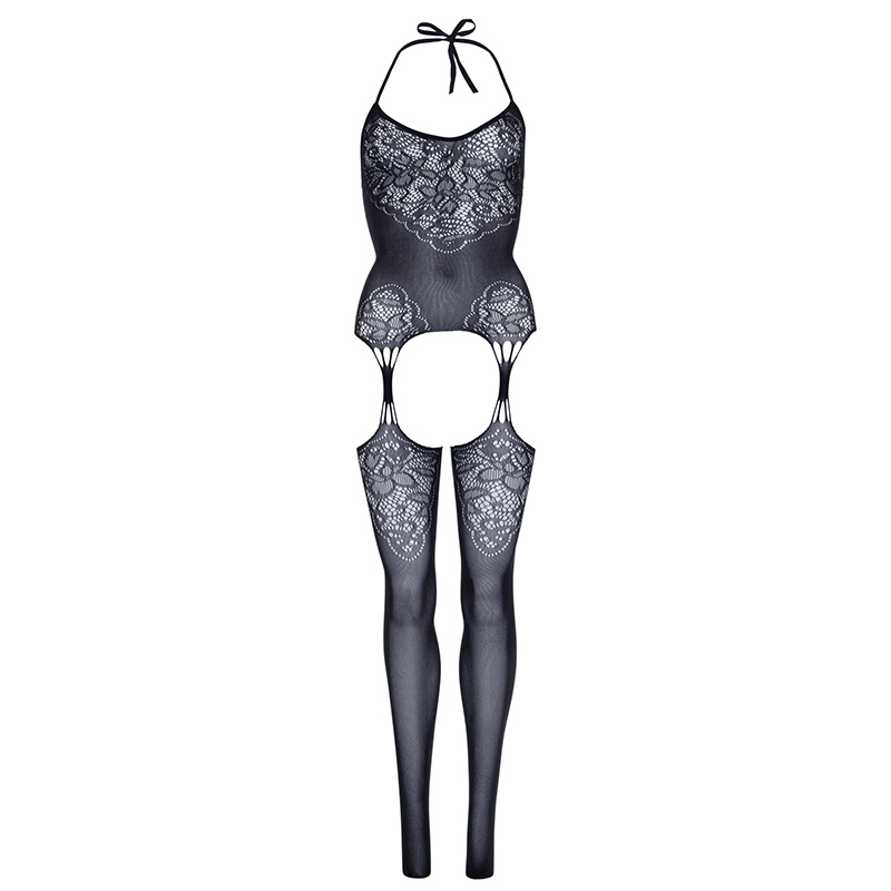 Open kruis halter bodystocking met luxe jaquard patroon en jarretel effect.