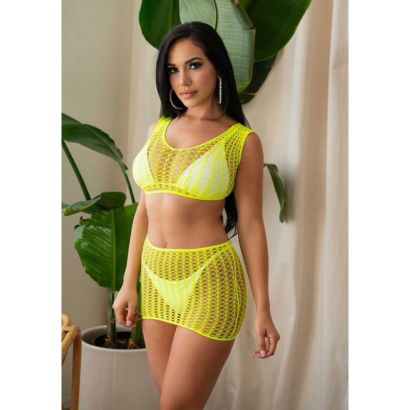 2 delige set bestaat uit een gehaakte visnet top en bijpassende minirok.