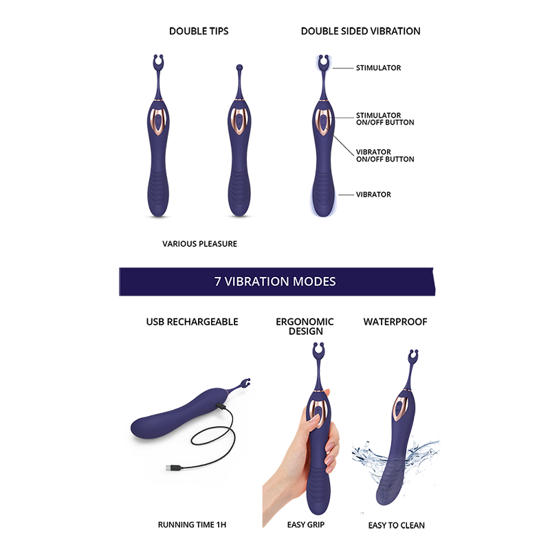 De Ô Mega is een clitorisvibrator en G-Spot vibrator in 1. De clitorisstimulator heeft 7 vibratiestanden en heeft een opzetstuk waardoor de vibrator wordt omgetoverd tot pin-point vibrator. De schacht is speciaal ontworpen om de G-Spot te stimuleren. De vibrator heeft 2 motoren die onafhankelijk van elkaar worden aangestuurd. Het opzetstuk met twee tips is perfect voor het stimuleren van de erogene zones zoals de tepels of de clitoris.