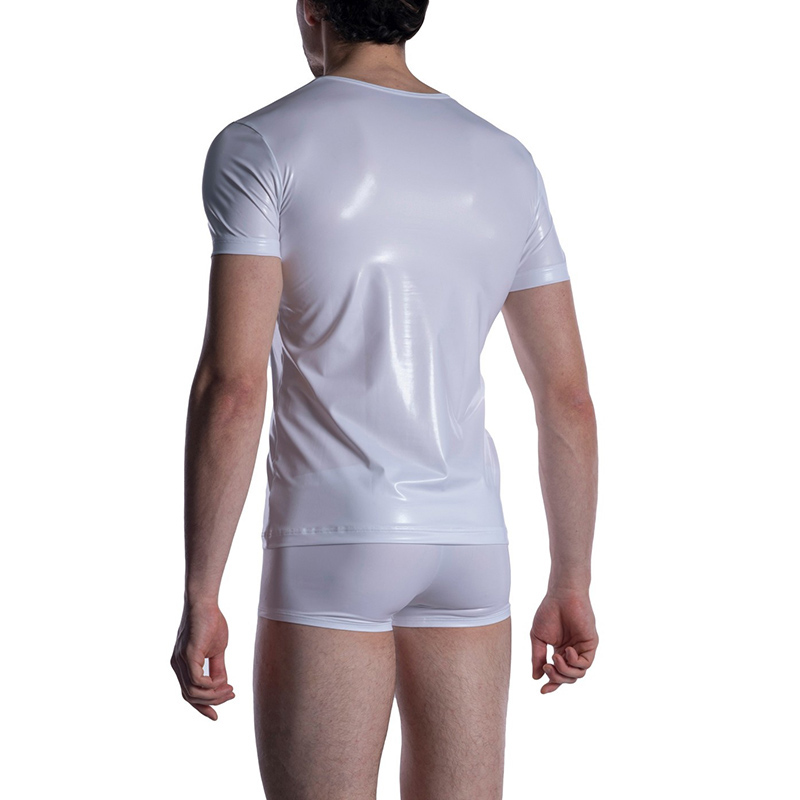 Je mannelijke pracht is verpakt – en toch zie je er naakt uit. Het glanzende wetlook materiaal van dit shirt met V-hals omhelst je Adonis-lichaam als een tweede huid en laat weinig aan de verbeelding over. De halslijn en de korte mouwen accentueren je gespierde bovenlichaam, terwijl je tepels lichtjes door de stof flitsen. Een t-shirt kan nauwelijks verleidelijker zijn, het ziet er niet alleen goed uit, je geniet ook van het hoogste niveau van comfort.