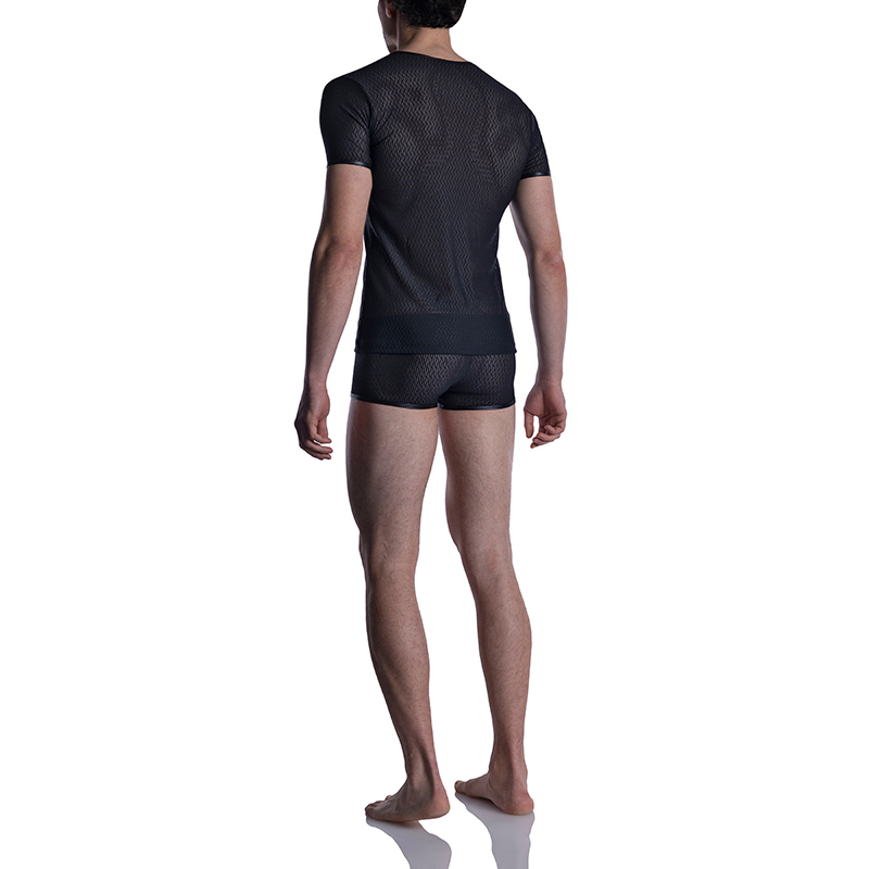 Getailleerd t-shirt met wijde diepe V-hals. De mannelijke roosterstructuur van het zeer elastische materiaal biedt warme transparantie. Een extra highlight: de smalle zwarte rand aan de hals en aan de armranden. Ze geven de uitstraling een feestelijk, bijzonder tintje. De zoom is aan één kant voorzien van het Manstore-label.