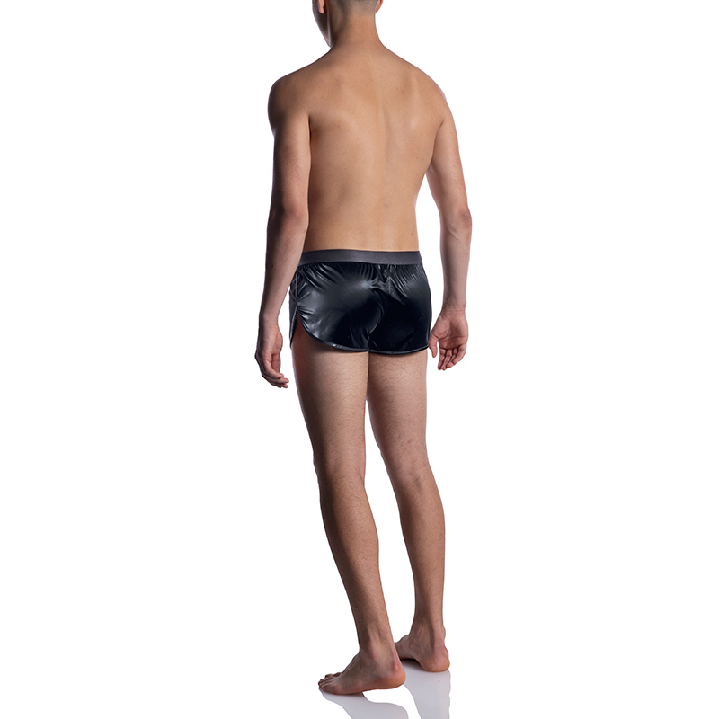 Sexy en sportief is deze Manstore M2055 Sprint short gemaakt van zwarte, strakke en glanzende stof. Laag model met zijsplitten. MNSTR elastische tailleband.