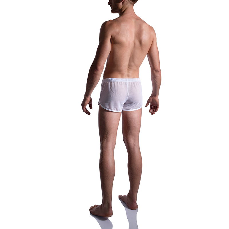 De sportieve MANSTORE M2181 Sprint Shorts in de kleuren wit en zwart transparant zijn verkrijgbaar in de maten S, M, L en XL .