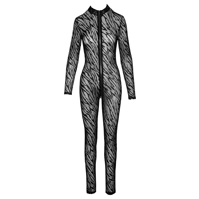 Ga los in deze verleidelijke Catsuit met safari print van Noir Handmade. Het transparante mesh-materiaal heeft een spannend dierenprintpatroon. De catsuit heeft lange mouwen en een kleine opstaande kraag, waardoor je een delicate, dominante look krijgt. Het pak uit één stuk heeft een ritssluiting over de hele lengte van de nek tot aan je kruis om het aantrekken te vergemakkelijken. De rits heeft een 3-weg systeem.