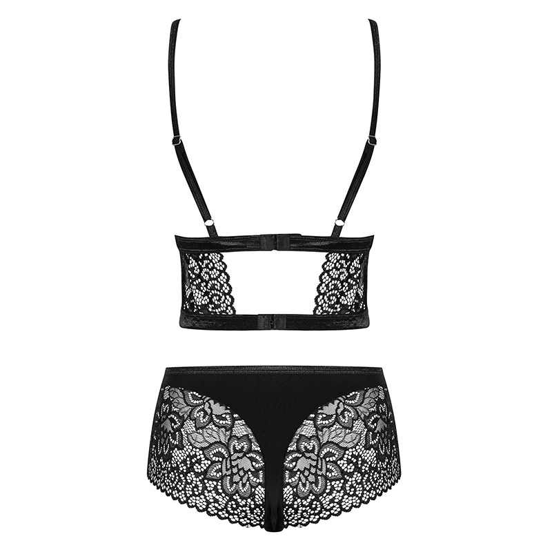 Top en short van transparant kant. Met verstelbare bandjes, meerlaagse sluiting op de rug en discrete cups. Een glanzende hanger tussen de cups geeft de set een luxe touch. De klassiek gesneden shorties hebben een elegante zoom en een ondoorzichtig stringdesign. Zacht en elastisch materiaal.