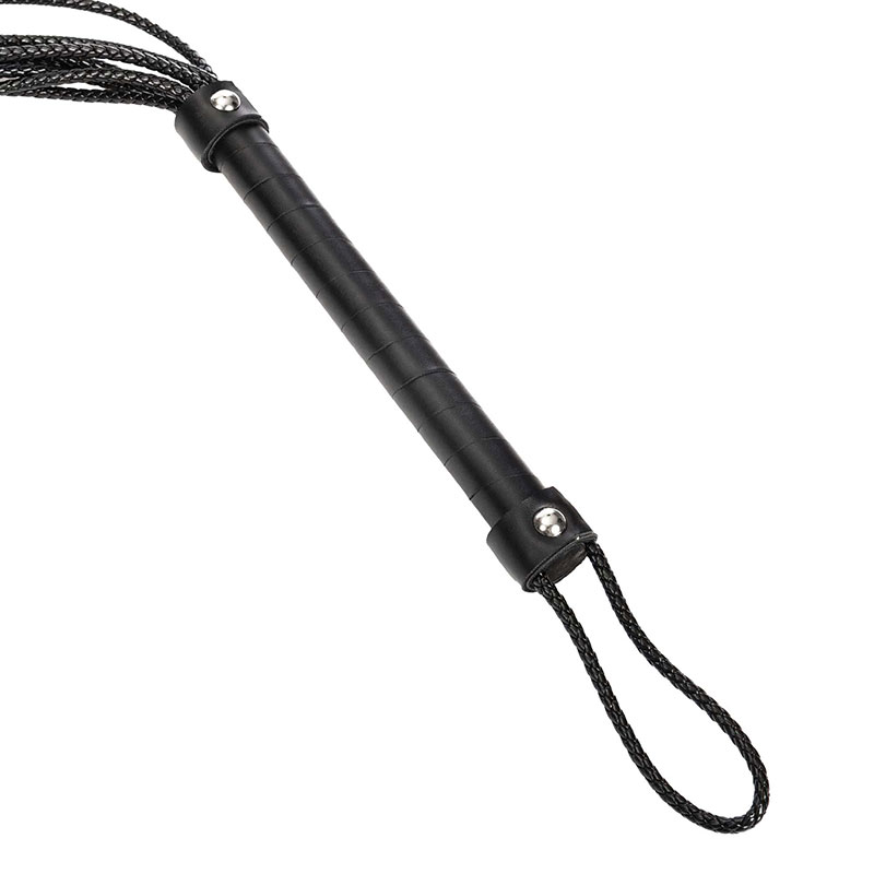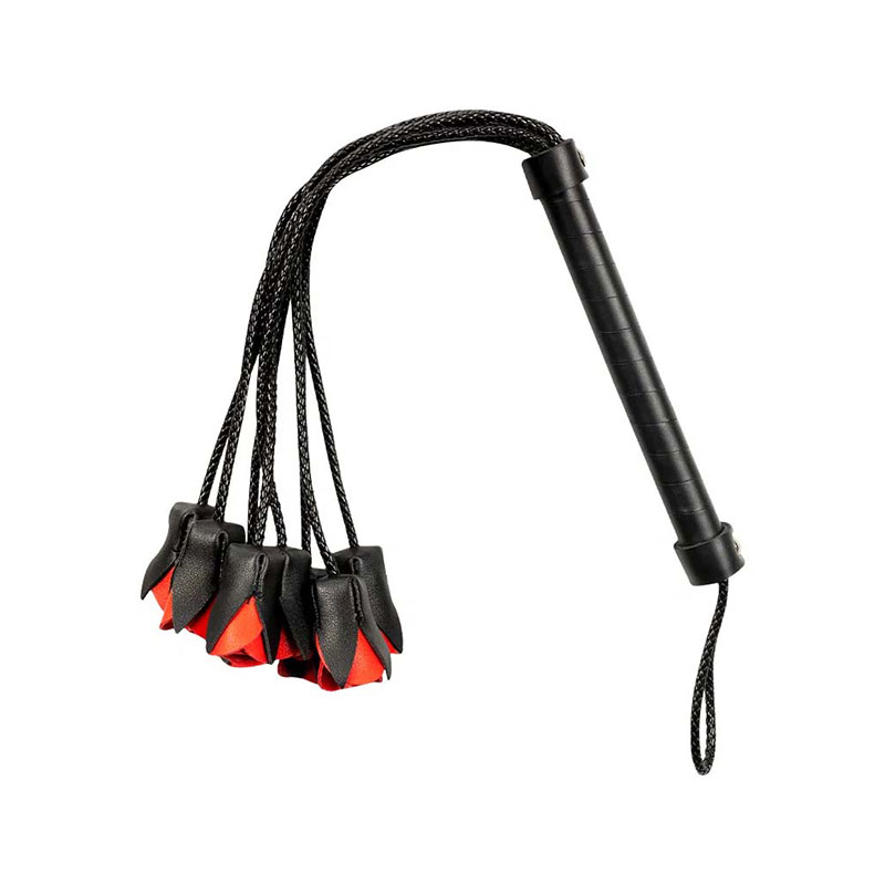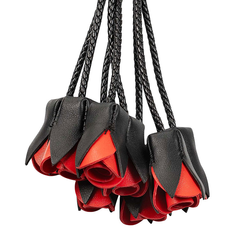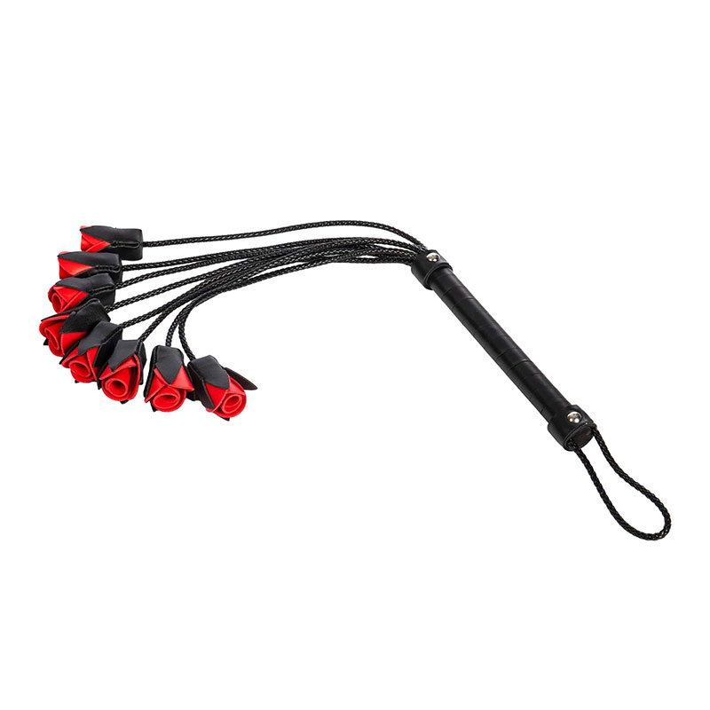 De diepzwarte basis en vurige rode rozen maken deze zweep een echte blikvanger in elke speelse setting.