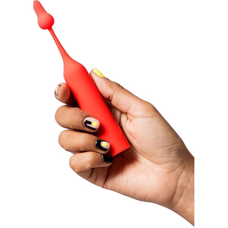 Minivibrator Pop van ROMP met 2 verschillende opzetstukken voor nauwkeurige stimulatie van alle externe genotspunten, vooral de clitoris. Lichtgewicht en gemakkelijk te gebruiken, het kan sensueel worden opgenomen in elk solo- of koppelspel. En dankzij de waterdichtheid kan hij ook mee in bad of onder de douche.