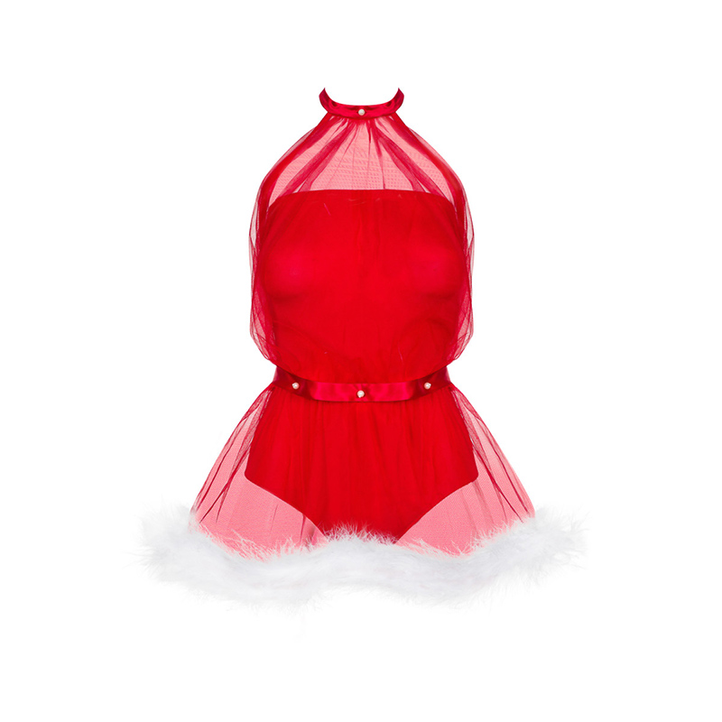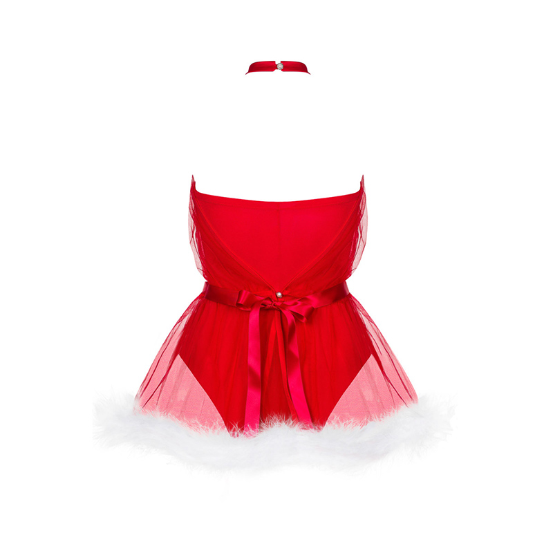 - Verleidelijk kerstkostuum versierd met witte franjes