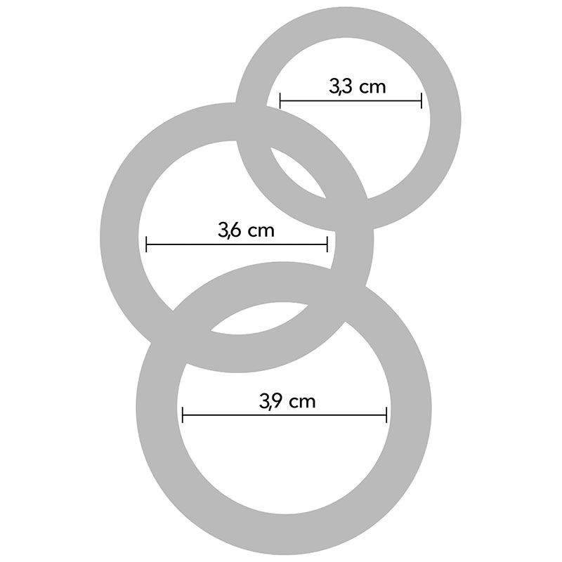 - Ring diameters: 3,3 cm – 3,6 cm – 3,9 cm