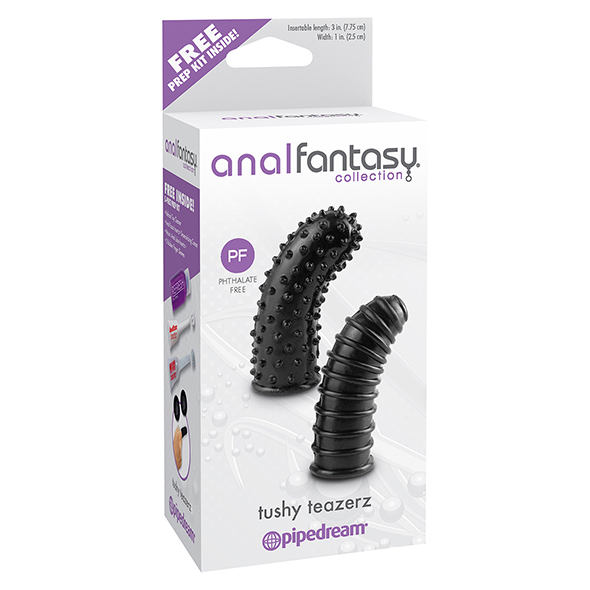 Met de Anal Fantasy Tushy Teazers ervaar je het optimale anale plezier. Het buigzame siliconenhoesje schuif je eenvoudig over je vinger, een kleine vibrator of een ander hulpmiddel. De buitenkant ervan bestaat uit ribbels, waarbij de verschillende designs van de twee Anal Fantasy Tushy Teazers voor een afwisselende stimulatie zorgen. Door zijn bescheiden formaat is dit seksspeeltje de ideale keuze voor als je een nieuwkomer bent op het gebied van anale seks. Uiteraard zijn ze gemakkelijk schoon te maken, te gebruiken in combinatie met glijmiddel en ook geschikt voor vaginale penetratie.