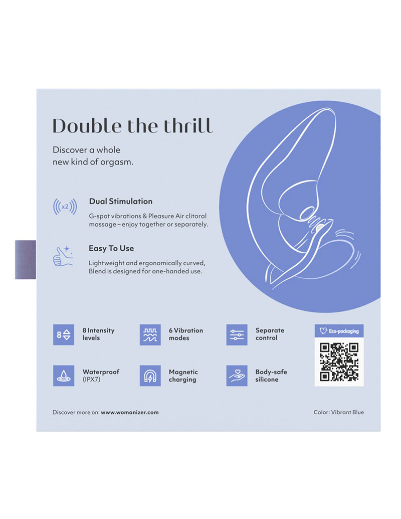 De elegante BLEND van Womanizer combineert de revolutionaire Pleasure Air technologie met intense G-spot stimulatie in één speeltje. Hij wordt geleverd in een zeer handig formaat en is super eenvoudig te gebruiken! De pulsator verwent zachtjes de clitoris aan de buitenkant, terwijl de G-zone in de vagina tegelijkertijd wordt verwend door krachtige vibraties. Dit maakt sensationele gemengde orgasmes mogelijk!