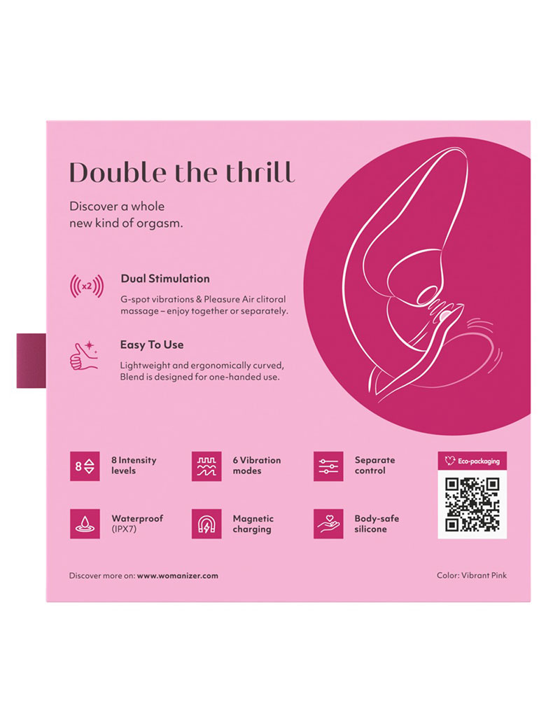 De elegante BLEND van Womanizer combineert de revolutionaire Pleasure Air technologie met intense G-spot stimulatie in één speeltje. Hij wordt geleverd in een zeer handig formaat en is super eenvoudig te gebruiken! De pulsator verwent zachtjes de clitoris aan de buitenkant, terwijl de G-zone in de vagina tegelijkertijd wordt verwend door krachtige vibraties. Dit maakt sensationele gemengde orgasmes mogelijk!