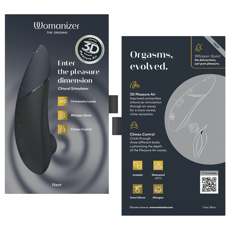 De Womanizer NEXT nu met vrijwel stille 3D Pleasure Air-technologie, die de clitoris contactloos en met uiterste nauwkeurigheid stimuleert. Met 14 intensiteitsniveaus (+/-) en de nieuwe Climax Control in 3 niveaus kan de gebruiker niet alleen de intensiteit maar ook de diepte van de pulserende drukgolven aanpassen voor een ongeëvenaard natuurlijk gevoel. En ervaar meerdere orgasmes! Zonder gewenningseffect of overprikkeling. Voor een ontspannen einde van een orgasme schakelt de NEXT vervolgens met één druk op de knop direct terug naar het laagste niveau (afterglow).