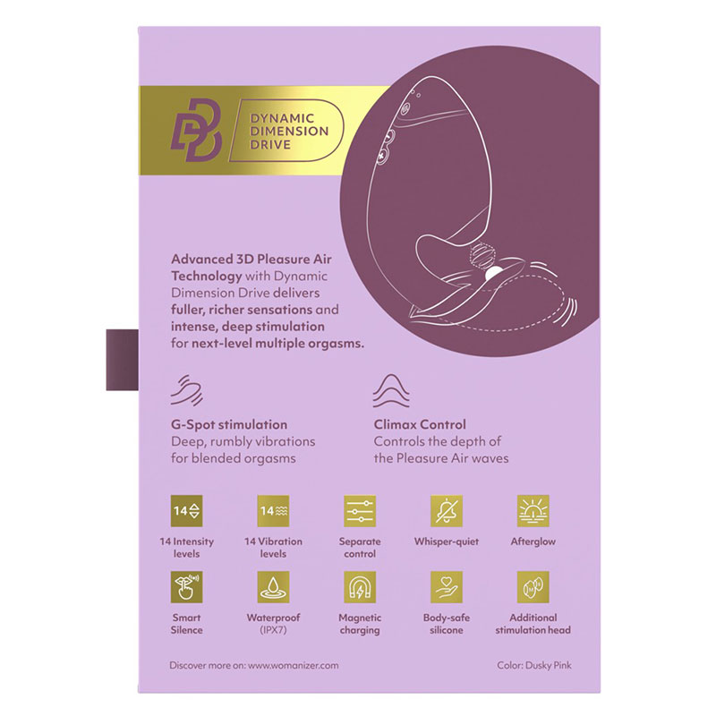De Womanizer Next Duo Roze combineert de revolutionaire 3D Pleasure Air Technology voor de clitoris met krachtige G-spotstimulatie – nu nog intenser dankzij de nieuwe Dynamic Dimension Drive! Deze vrijwel geruisloze (37 dB) dubbele stimulator biedt een compleet nieuw niveau van gemengde orgasmes.