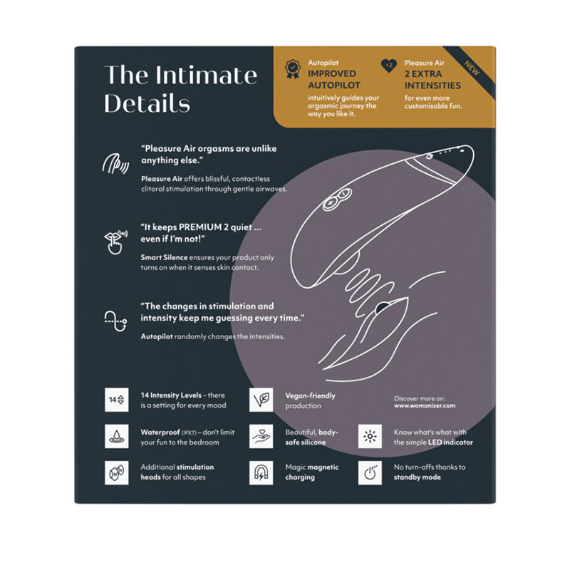 De Womanizer Premium 2 Black is een krachtige, maar fluisterstille drukgolfstimulator en verwent nu met 14 (in plaats van 12) verschillende intensiteiten die met een druk op de knop gemakkelijk op en neer kunnen worden geregeld (+/-).